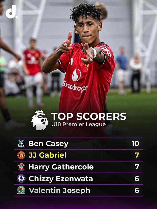 弗莱彻麾下的头号球星是年仅14岁的加布里埃尔(JJ Gabriel),他在与曼城的比赛取得了进球,这个赛季迄今6场英超2级联赛已经打入了7球,排名射手榜第二位,比任何红魔队友的进球都至少多一倍。